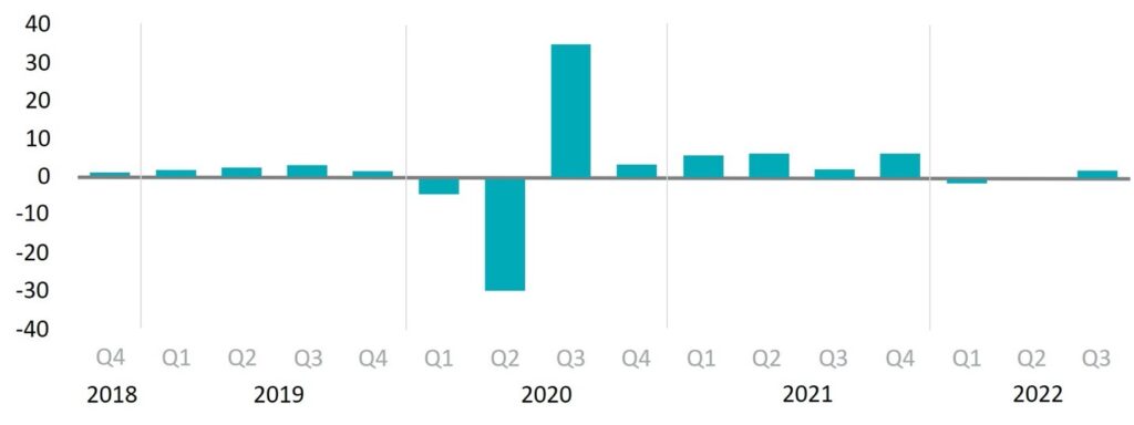 Quarterly GDP has rebounded to a more normal, positive level. Two consecutive quarters of negative GDP is one measure of recession, but the overall strength of the economy counterbalanced the dip in GDP in the first and second quarter.