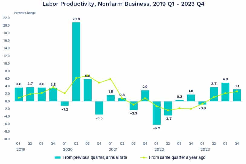 How has this been possible? Labor productivity expanded in all four quarters of 2023, and for the last three quarters, it expanded by more than 3%. Workers producing more is keeping costs lower and helping the Fed in the fight against inflation.