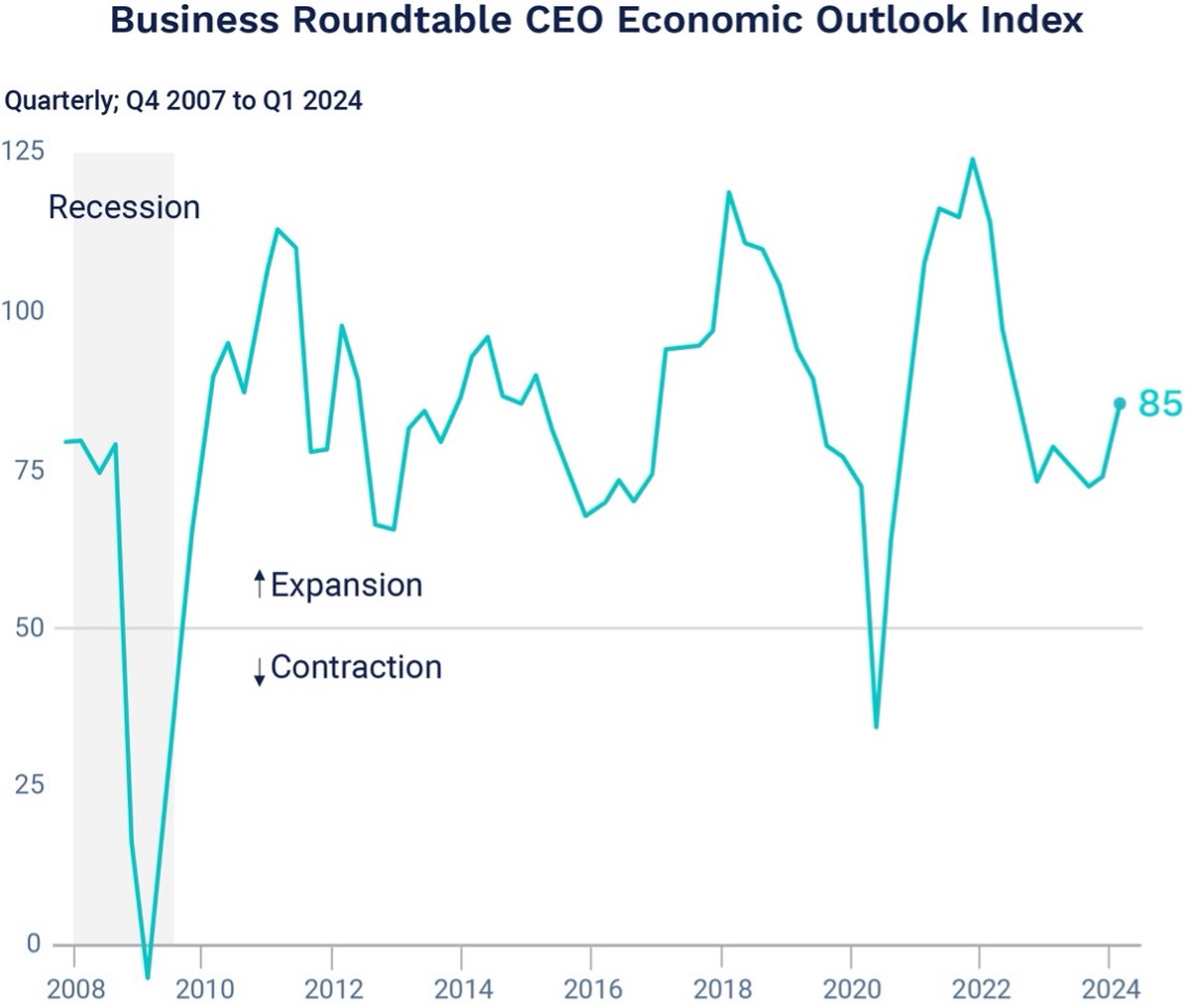 CEOs are expressing confidence about the economy with expectations of stronger sales and capital investments. The CEO Economic Outlook Index jumped in the first quarter and is currently above the long-term average by two points.