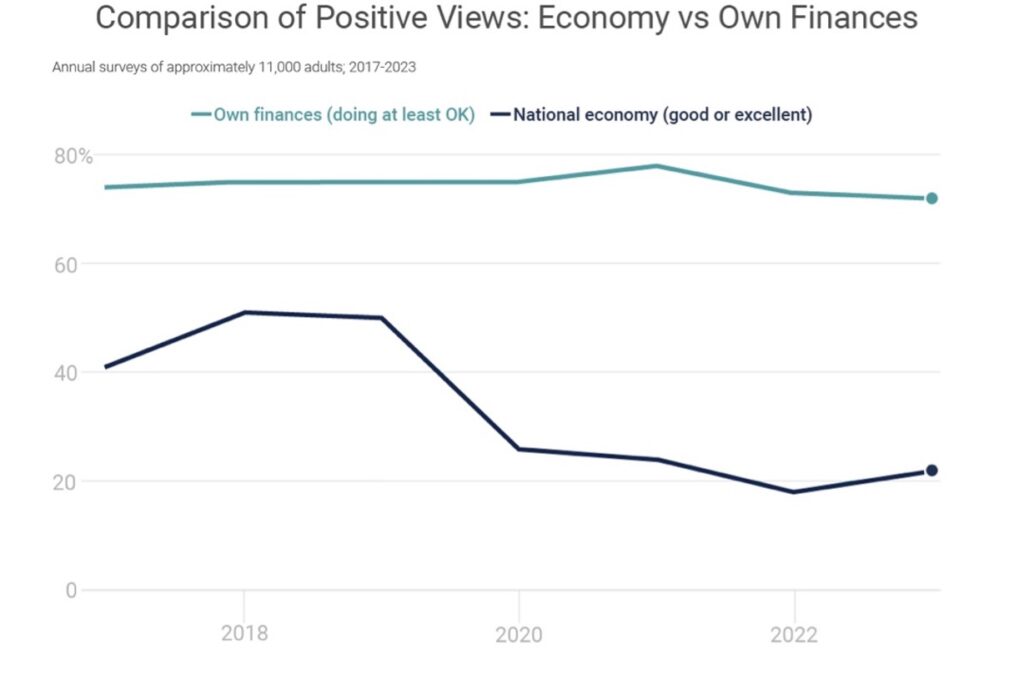 Most Americans who assess their own finances positively don’t feel the same way about the economy. This so-called “vibecession” can have real consequences, as it may result in slipping consumer confidence that ultimately leads to lower spending and an economic slowdown.