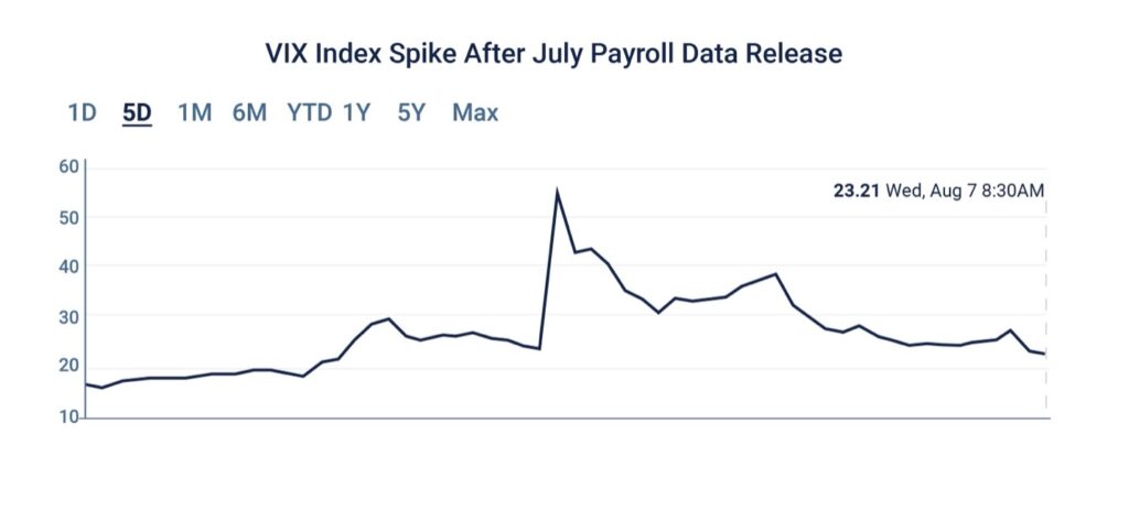 After weeks of Olympic-themed press reports about the Fed “sticking the (soft) landing” and safely guiding the economy to a place where inflation is coming down and growth is holding off recession, one very bad labor report flipped the script. The threat of recession is not just in the future, it may be here now, according to some reports. The VIX index, a measure of stock market volatility, spiked above 50 on the first market day after the non-farm payroll numbers came out, a level last seen in March of 2020.